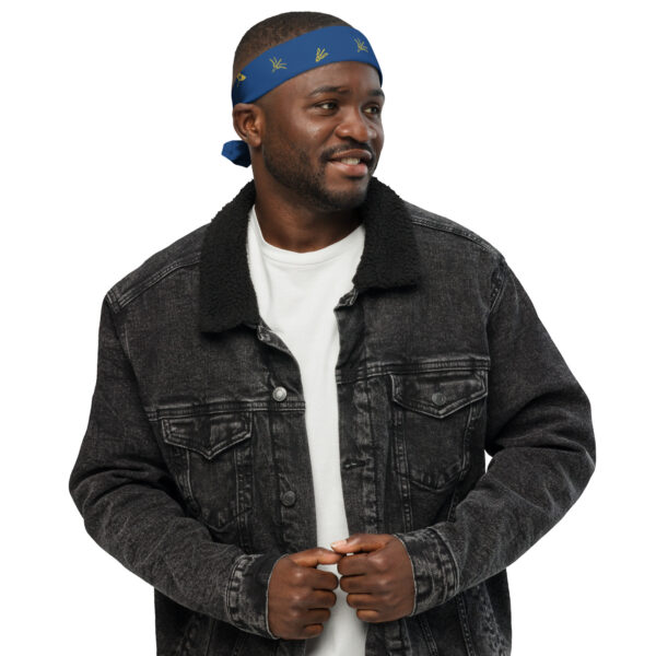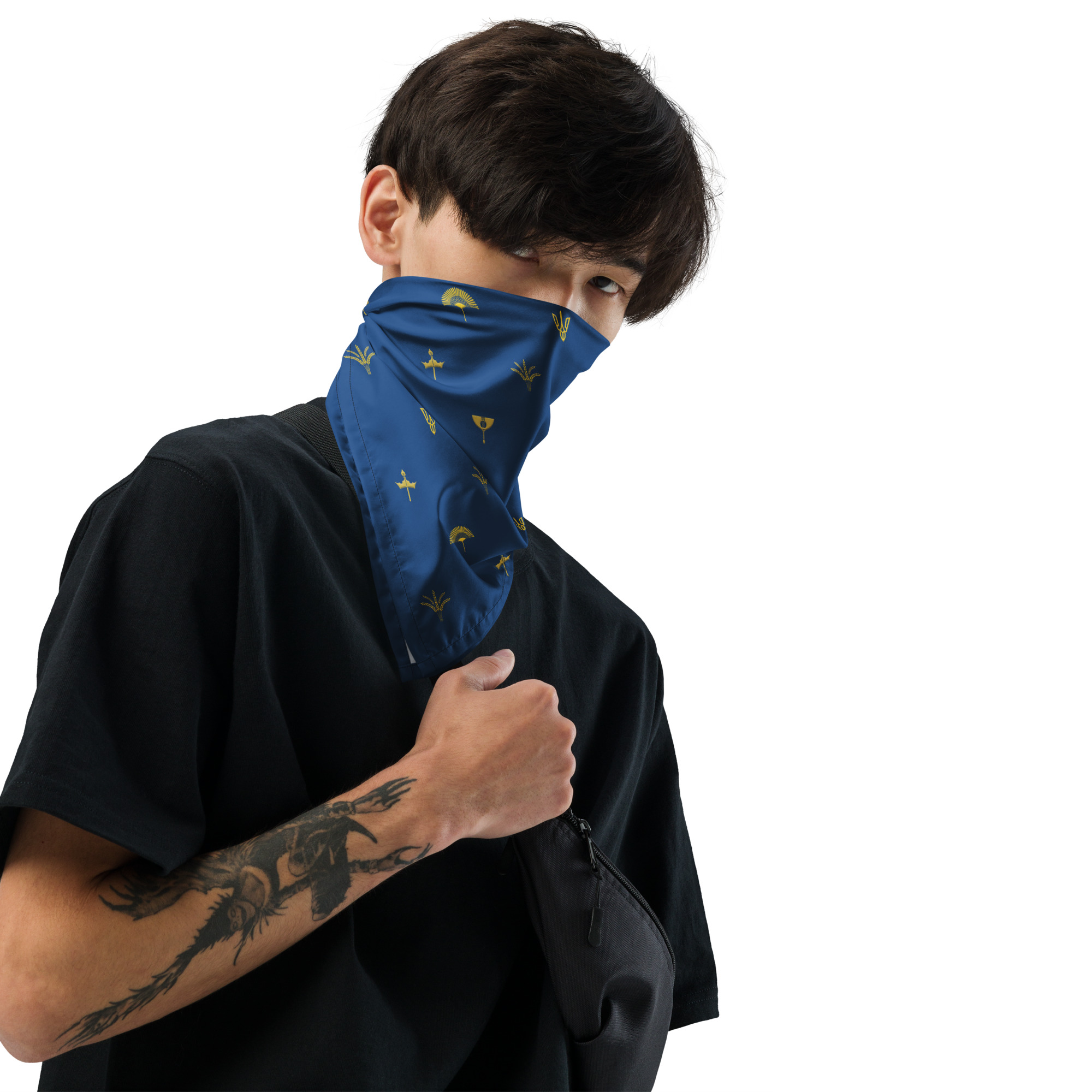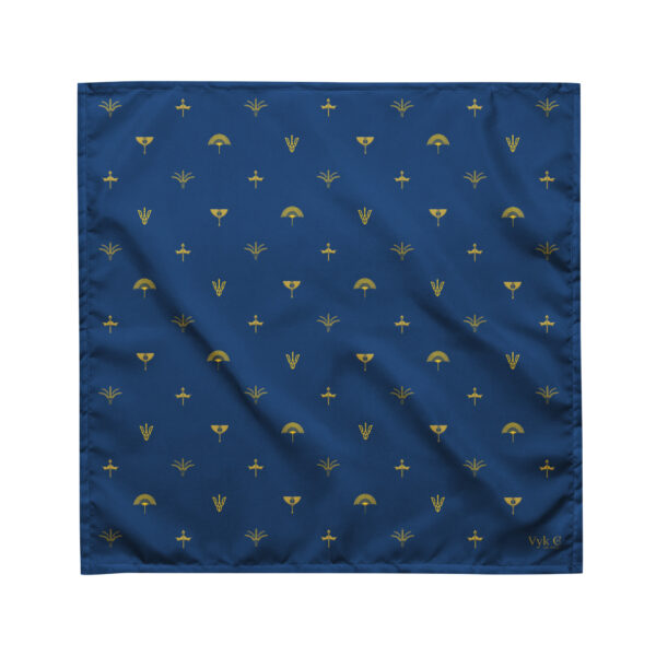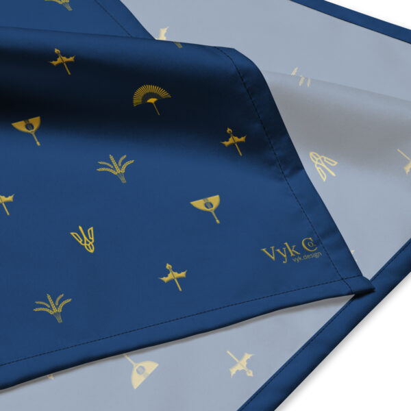90% of proceeds go to rebuilding vital infrastructure in Ukraine. Show your support for Ukraine with this sleek scarf featuring symbols of the country: the wheat stalk, the sunflower, the kobza, the trident of Volodymyr the Great, the presidential sceptre and the Kievan crown.
